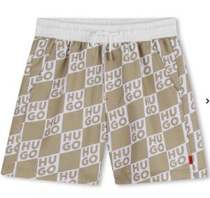 HUGO zand kleur jogging short met all over logo in een ruitje en sport strepen aan de zij kant.